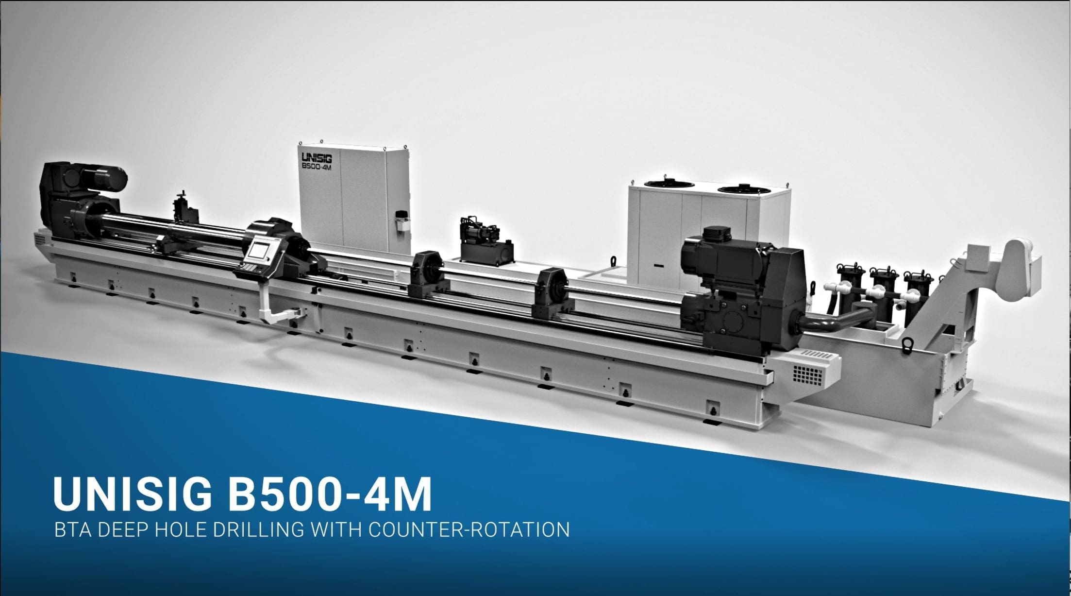 UNISIG B500-4M BTA drilling machine features start with a massive total spindle power of 130 HP [100KW], facilitating drilling up to 5 inches [127mm] in diameter and here 13 feet [4M] deep. The video illustrates more features of this capable deep hole drilling machine. Use this link to read more about UNISIG B-Series machines.